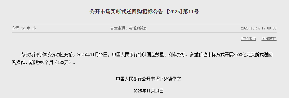 为保持银行体系流动性充裕,11月17日,中国人民银行(以下简称央行)以固定数量、利率招标、多重价位中标方式开展8000亿元买断式逆回购操作,期限为6个月(182天)。数据显示,11月有3000亿元6个月期买断式逆回购到期。这也意味着,本月6个月期买断式逆回购加量续作5000亿元。