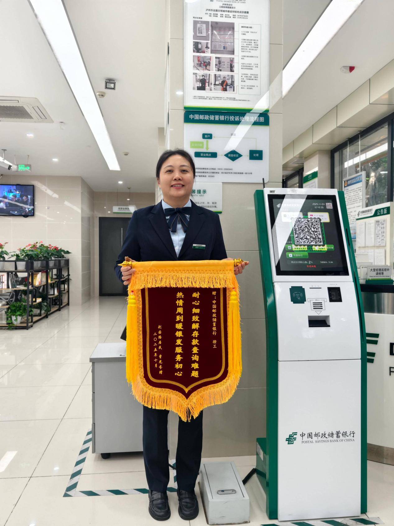 近日,邮储银行泸州市刺园路支行收到了一份沉甸甸的“心意”——客户曹奶奶亲自送来的一面锦旗。锦旗上写着“耐心细致解存款查询难题,热情周到暖银发服务初心”,寥寥数语,却蕴含着一段日积月累的温情故事,成为该行“客户至上”服务理念最生动的诠释。