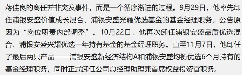 据《新浪基金》整理,2025929日,因“岗位职责内部调整”,蒋佳良率先卸任浦银安盛价值成长混合、浦银安盛光耀优选基金的基金经理职务。随后在1022日,他再次卸任浦银安盛品质优选混合、浦银安盛兴耀优选一年持有基金的基金经理职务。直至117日,他卸任了最后两只产品——浦银安盛新经济结构A和浦银安盛均衡优选6个月持有的基金经理职务,同时正式卸任公司总经理助理兼首席权益投资官职务。