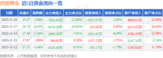 证券之星消息,截至2025年11月18日收盘,西部黄金(601069)报收于25.97元,下跌2.88%,换手率1.53%,成交量13.62万手,成交额3.55亿元。