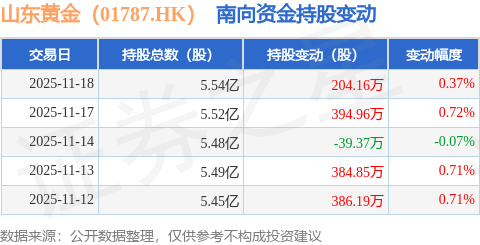 证券之星消息,11月18日南向资金增持204.16万股山东黄金(01787.HK)。近5个交易日中,获南向资金增持的有4天,累计净增持1330.79万股。近20个交易日中,获南向资金增持的有13天,累计净增持984.08万股。截至目前,南向资金持有山东黄金(01787.HK)5.54亿股,占公司已发行普通股的55.68%。