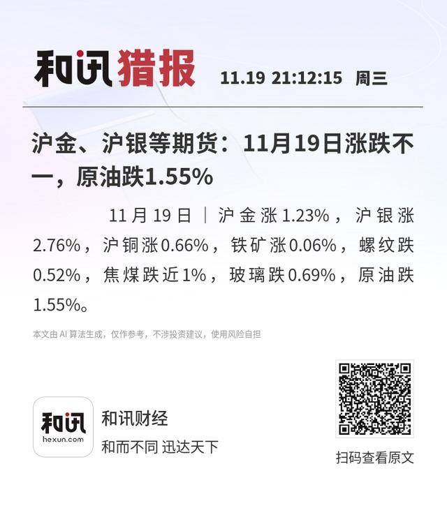 11月19日|沪金涨1.23%,沪银涨2.76%,沪铜涨0.66%,铁矿涨0.06%,螺纹跌0.52%,焦煤跌近1%,玻璃跌0.69%,原油跌1.55%。