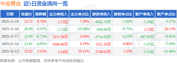 证券之星消息,截至2025年11月19日收盘,中金黄金(600489)报收于22.72元,上涨8.76%,换手率2.24%,成交量108.66万手,成交额23.97亿元。