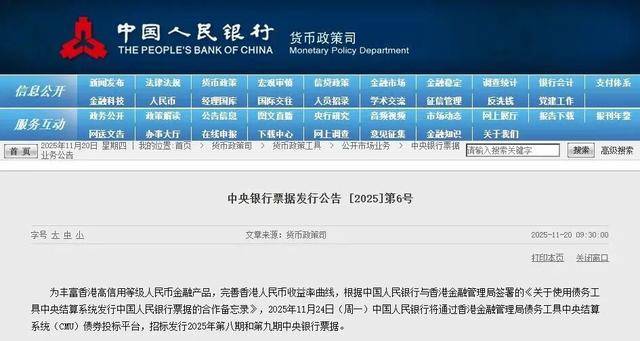 11月20日,中国人民银行官网发布中央银行票据发行公告[2025]第6号。
