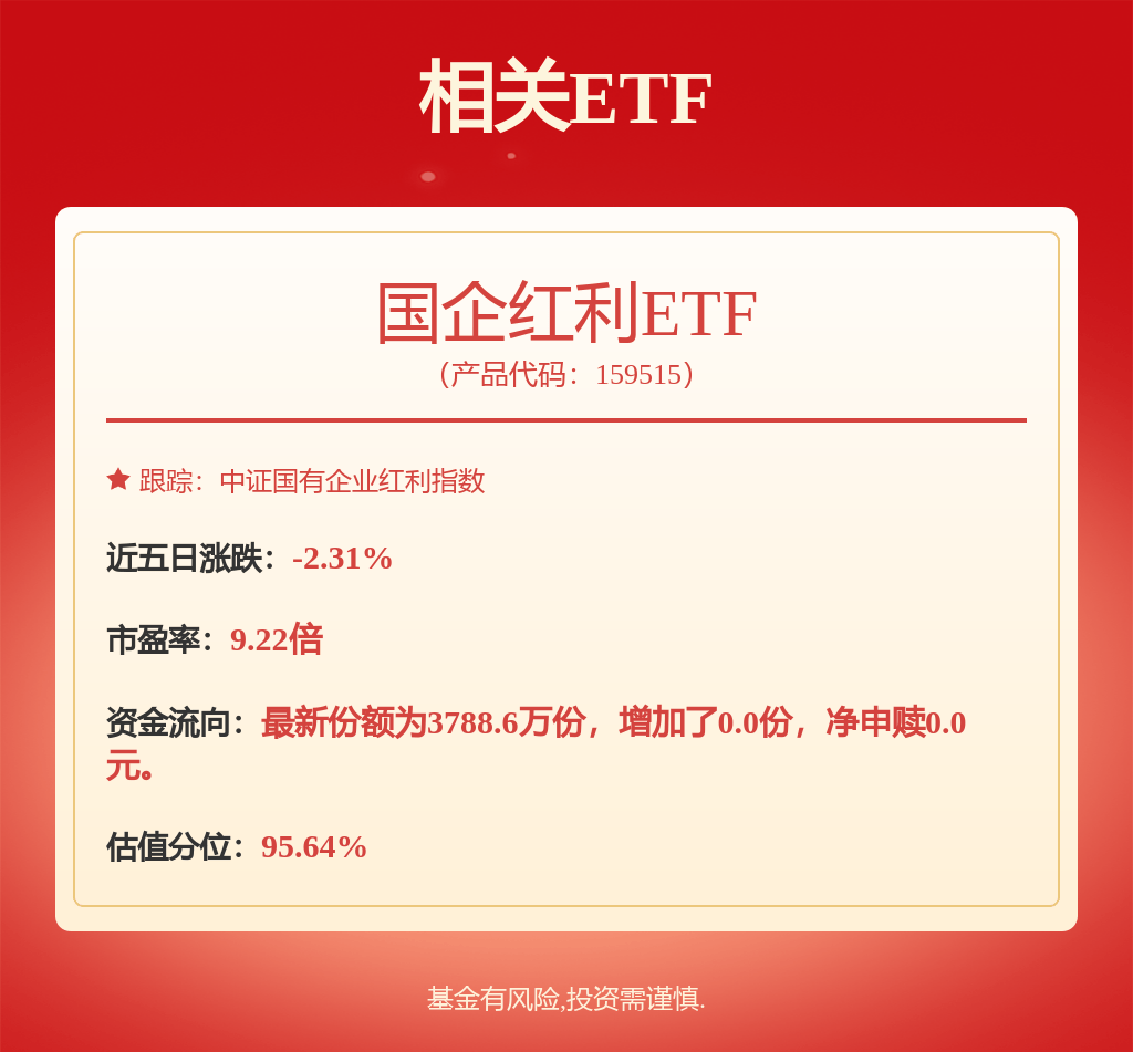中证国有企业红利指数(000824)由中证指数有限公司(“中证”)编制和计算,其所有权归属中证及/或其指定的第三方。中证对于标的指数的实时性、准确性、完整性和特殊目的的适用性不作任何明示或暗示的担保,不因标的指数的任何延迟、缺失或错误对任何人承担责任(无论是否存在过失)。中证对于跟踪标的指数的产品不作任何担保、背书、销售或推广,中证不承担与此相关的任何责任。”