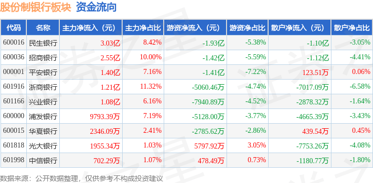 从资金流向上来看,当日股份制银行板块主力资金净流入10.74亿元,游资资金净流出6.23亿元,散户资金净流出4.51亿元。股份制银行板块个股资金流向见下表: