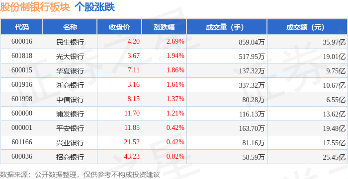 证券之星消息,11月20日股份制银行板块较上一交易日上涨0.81%,民生银行领涨。当日上证指数报收于3931.05,下跌0.4%。深证成指报收于12980.82,下跌0.76%。股份制银行板块个股涨跌见下表: