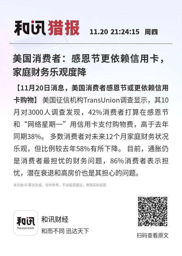 【11月20日消息,美国消费者感恩节或更依赖信用卡购物】美国征信机构TransUnion调查显示,其10月对3000人调查发现,42%消费者打算在感恩节和“网络星期一”用信用卡支付购物费,高于去年同期38%。 多数消费者对未来12个月家庭财务状况乐观,但比例较去年58%有所下降。 目前,通胀仍是消费者最担忧的财务问题,86%消费者表示担忧,潜在衰退和高房价也是其担心的问题。