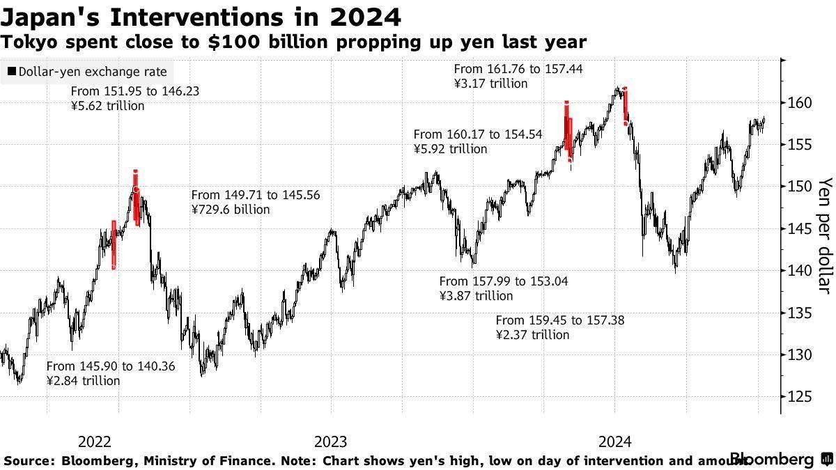 去年,日本四次干预市场以支撑日元汇率,耗资约1000亿美元。自2022年以来,日本的干预行动已耗资约1730亿美元