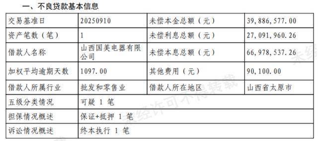 另外,光大银行太原分行则在转让山西国美电器有限公司不良贷款转让项目。该项目未偿本金总额3988.65万元、未偿利息总额2709.1万元,未偿本息总额6697.85万元。