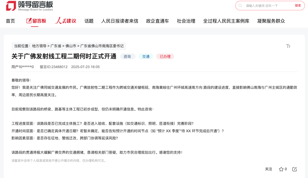 今年7月份,有网友在领导留言板咨询关于 广佛发射线工程二期何时正式开通的问题,当时, 南海区交通运输局回应: 预计2025年12月底前可完工通车