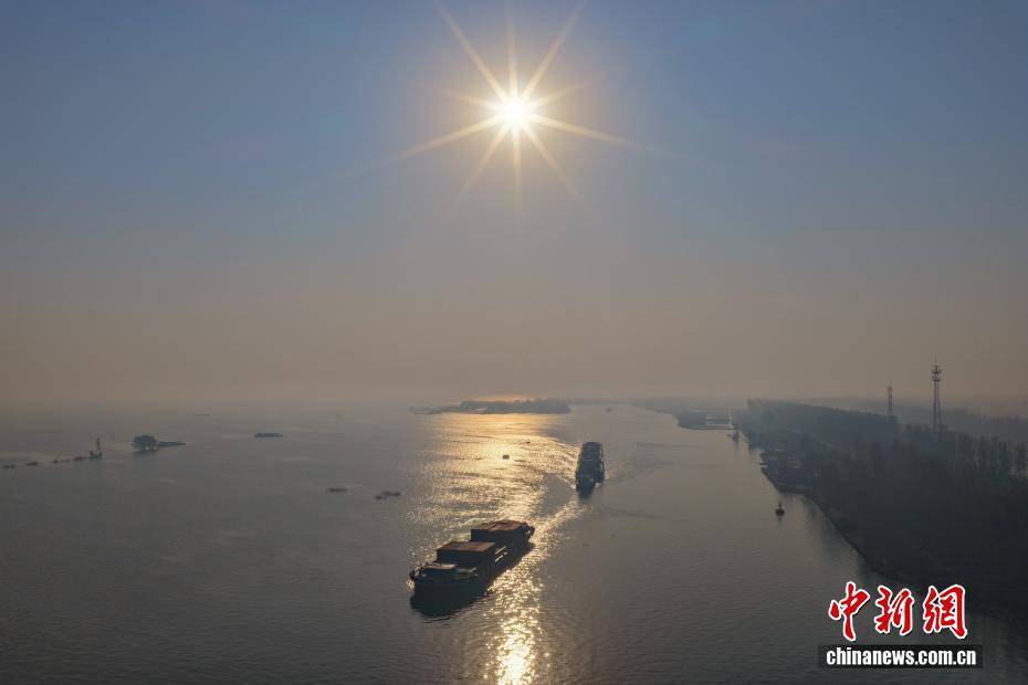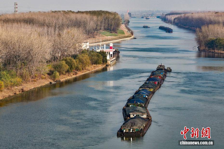 11月20日,航拍京杭运河徐州邳州段,船舶有序行驶。作为贯通南北的“黄金水道”,京杭运河江苏段航运繁忙,流动的河水、行驶的船舶,在冬日静谧的景致中勾勒出一幅流动不息的壮美画卷。(无人机照片)