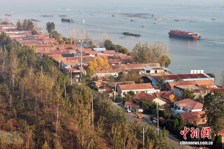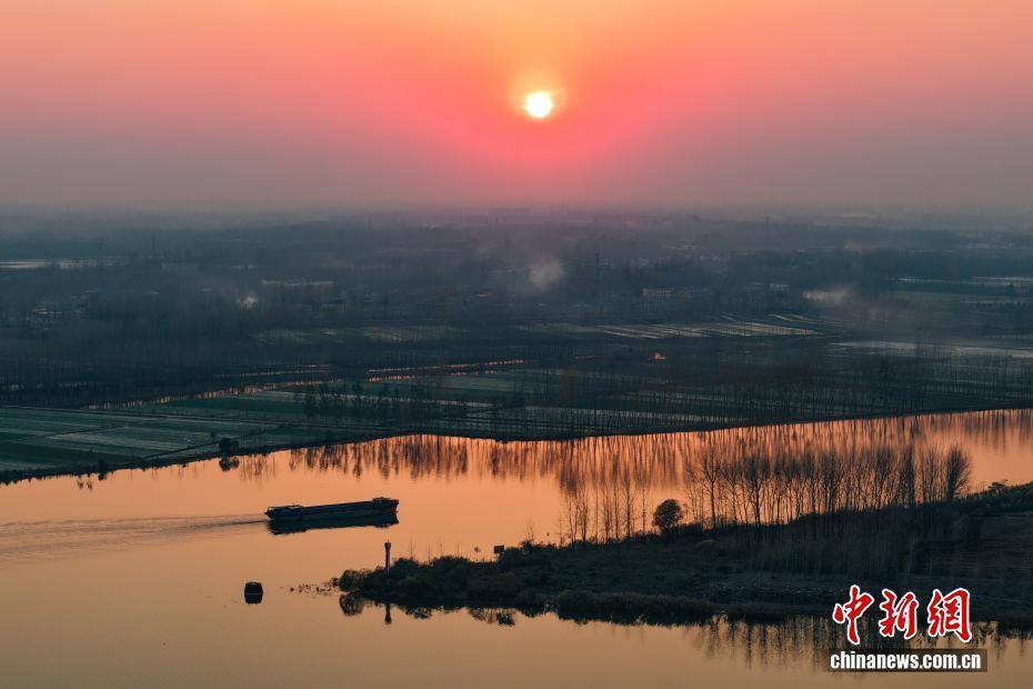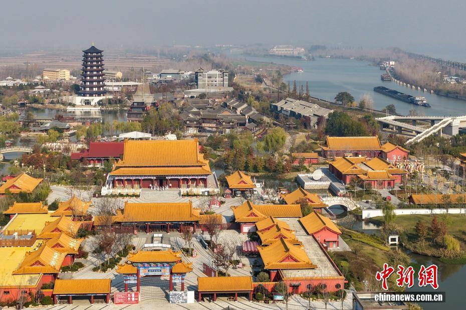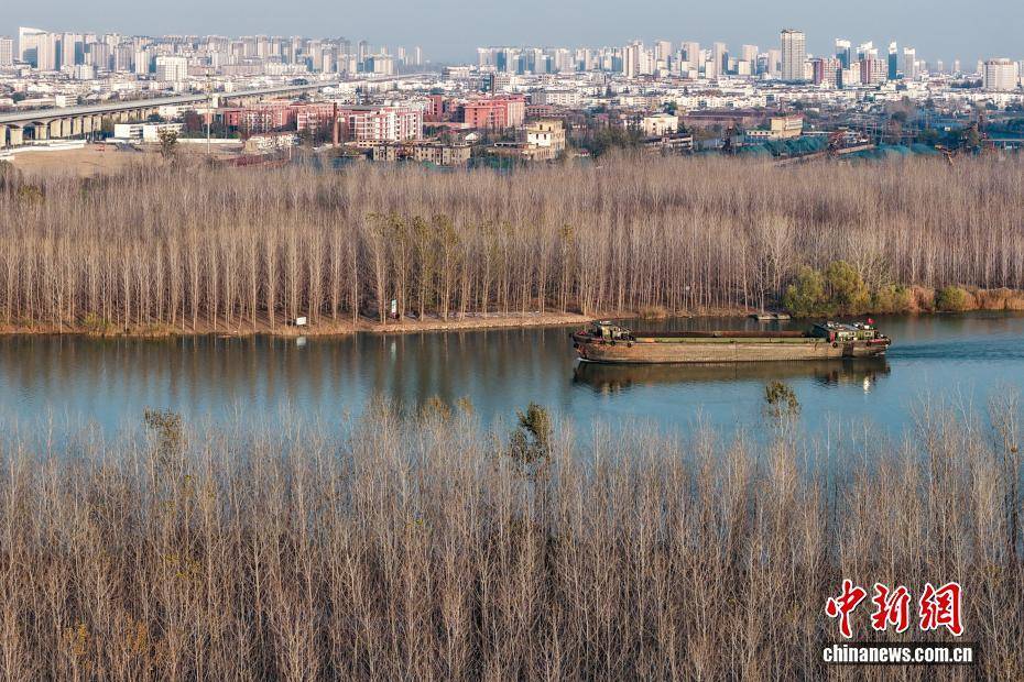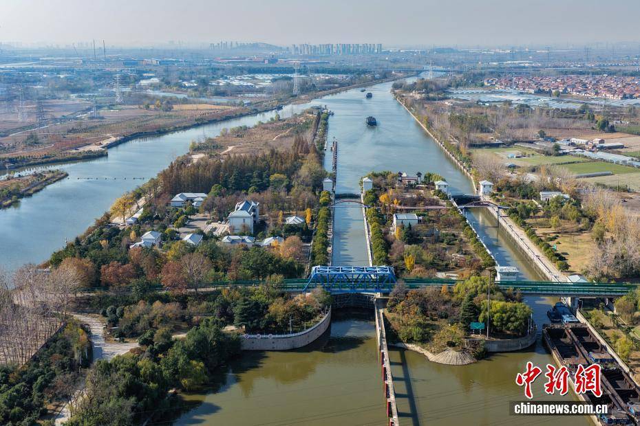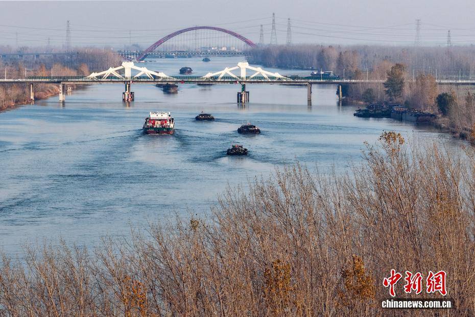 11月21日,航拍京杭运河宿迁龙运城段。作为贯通南北的“黄金水道”,京杭运河江苏段航运繁忙,流动的河水、行驶的船舶,在冬日静谧的景致中勾勒出一幅流动不息的壮美画卷。(无人机照片)中新社记者 泱波 摄
