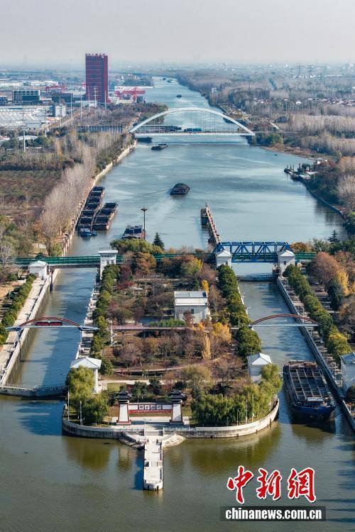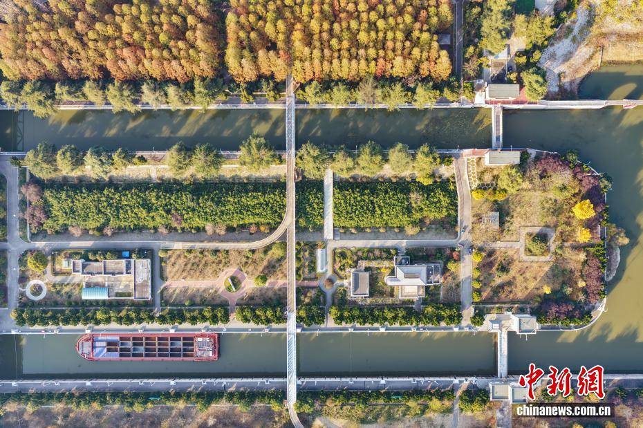 11月20日,航拍京杭运河徐州航务中心刘山船闸,船舶顺畅过闸。作为贯通南北的“黄金水道”,京杭运河江苏段航运繁忙,流动的河水、行驶的船舶,在冬日静谧的景致中勾勒出一幅流动不息的壮美画卷。(无人机照片)