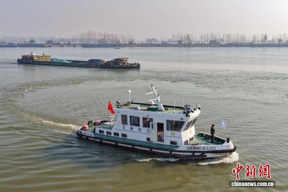 11月21日,航拍京杭运河宿迁骆马湖湖区航段,宿迁航务中心航政艇在水面上巡逻。作为贯通南北的“黄金水道”,京杭运河江苏段航运繁忙,流动的河水、行驶的船舶,在冬日静谧的景致中勾勒出一幅流动不息的壮美画卷。(无人机照片)中新社记者 泱波 摄