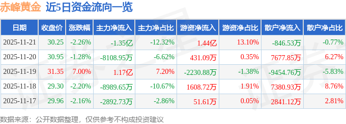 证券之星消息,截至2025年11月21日收盘,赤峰黄金(600988)报收于30.25元,下跌2.26%,换手率2.15%,成交量35.83万手,成交额10.97亿元。
