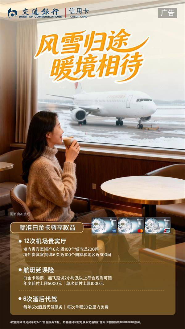 寒潮来袭?别怕!风雪途中有交通银行信用卡给你 “暖 buff”加持,在奔赴与抵达之间,在匆忙与期待之中,每个转场的间隙,都有温暖如约而至。从贵宾礼遇到延误保障再到安心抵达,交通银行标准白金卡旨在为你打造舒心旅程,让每一次出发与归来,都多一份从容与暖意。