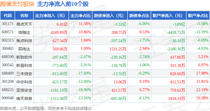 从资金流向上来看,当日跨境支付板块主力资金净流出15.84亿元,游资资金净流出2.79亿元,散户资金净流入18.63亿元。跨境支付板块个股资金流向见下表: