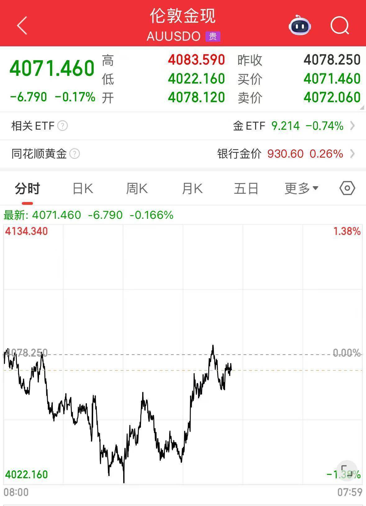 现货黄金直线拉升,跌幅收窄至0.17%,此前一度下跌1.39%。