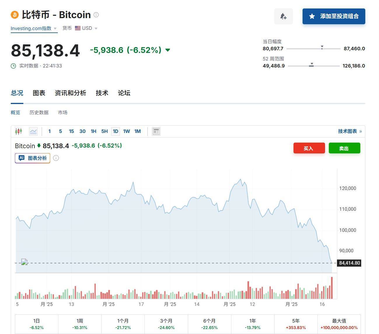 比特币回升至8.5万美元上方,此前一度跌至8万美元附近,日内跌幅收窄至6.5%左右。