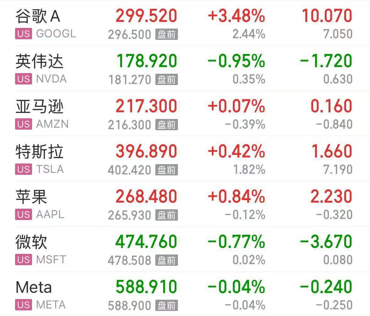 大型科技股涨跌不一,谷歌上涨3.48%,苹果、特斯拉、亚马逊微涨,英伟达、微软、Meta下跌。