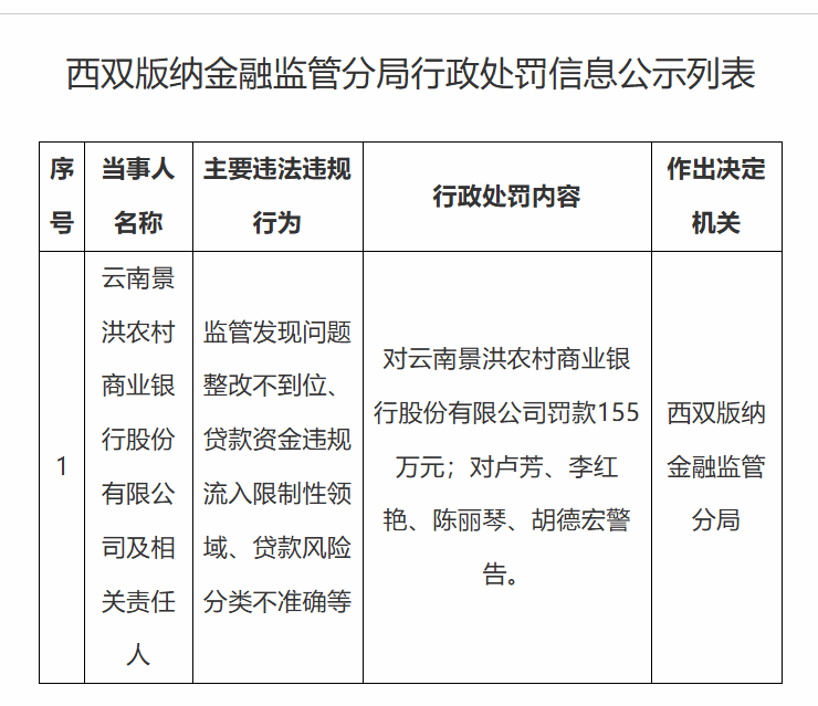 【大河财立方消息】11月21日,西双版纳金融监管分局披露的行政处罚信息公示列表显示,因监管发现问题整改不到位、贷款资金违规流入限制性领域、贷款风险分类不准确等,云南景洪农村商业银行股份有限公司罚款155万元。