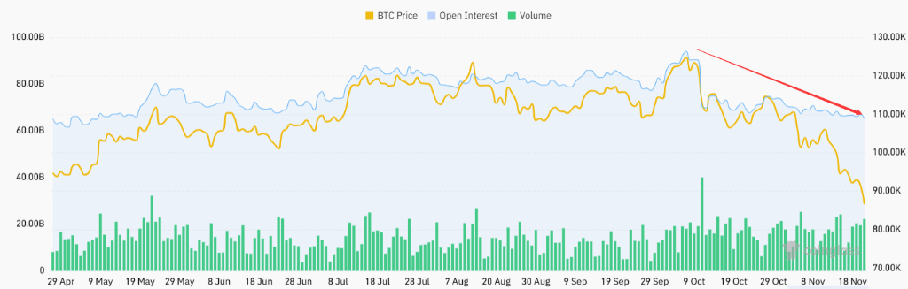 过去24小时内,又有20亿美元的杠杆头寸遭到清算,据CoinGlass数据显示。永续期货的未平仓合约较10月峰值940亿美元下降了35%,表明投资者正在大幅削减风险敞口。