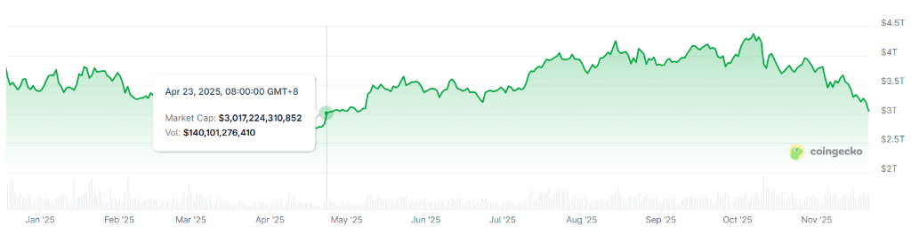周五第二大加密货币以太坊同样遭受重创,跌幅一度达到8.9%,跌破2,700美元。根据CoinGecko数据,整个加密货币市场总市值自4月以来首次跌破3万亿美元。