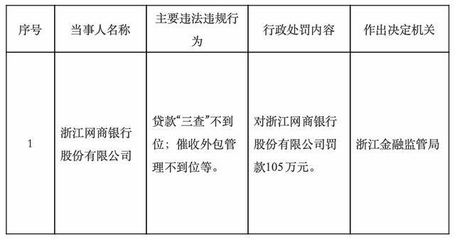 因贷款“三查”不到位、催收外包管理不到位等,浙江网商银行股份有限公司被罚款105万元。