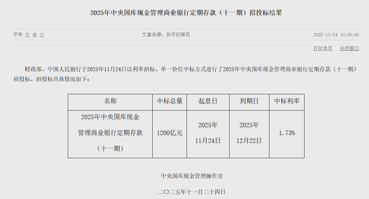 财政部、中国人民银行于2025年11月24日以利率招标、单一价位中标方式进行了2025年中央国库现金管理商业银行定期存款(十一期)招投标。