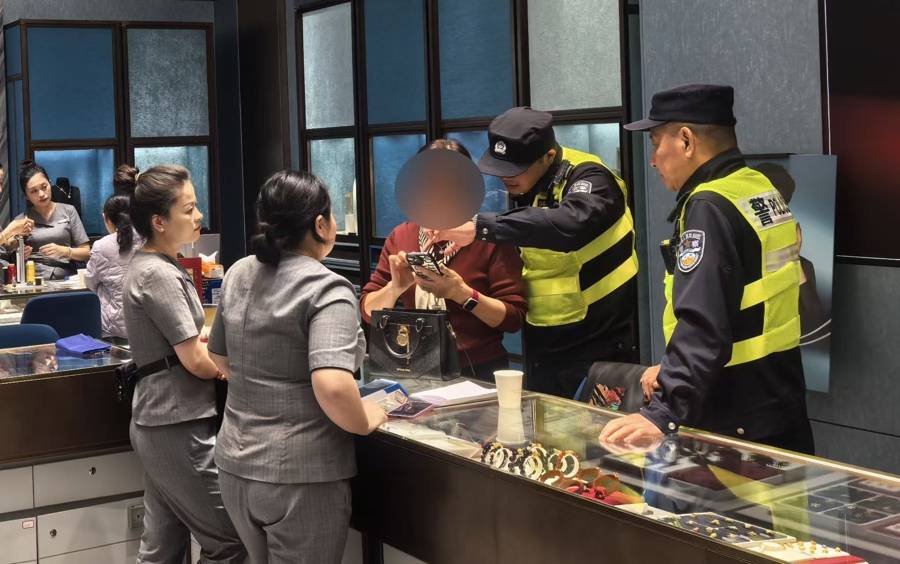 11月10日,某商场金店负责人向警方反映:一名女子进店后不挑款式、不问工艺,只强调要购买总重恰好320克的黄金饰品和金条。这一异常行为与反诈预警信息高度吻合。高境派出所民警迅速赶到现场,发现该女子正急于离开。