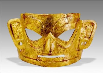 无独有偶,在成都金沙遗址,同样出土了规模较大的薄片状黄金制品。令人瞩目的金沙黄金面具,鼻子高挺,双眼镂空约呈菱形,耳垂穿孔,造型风格与三星堆金面具颇为相似。除金面具外,金沙遗址亦发现鱼形饰、圆片饰等三星堆同款金器。