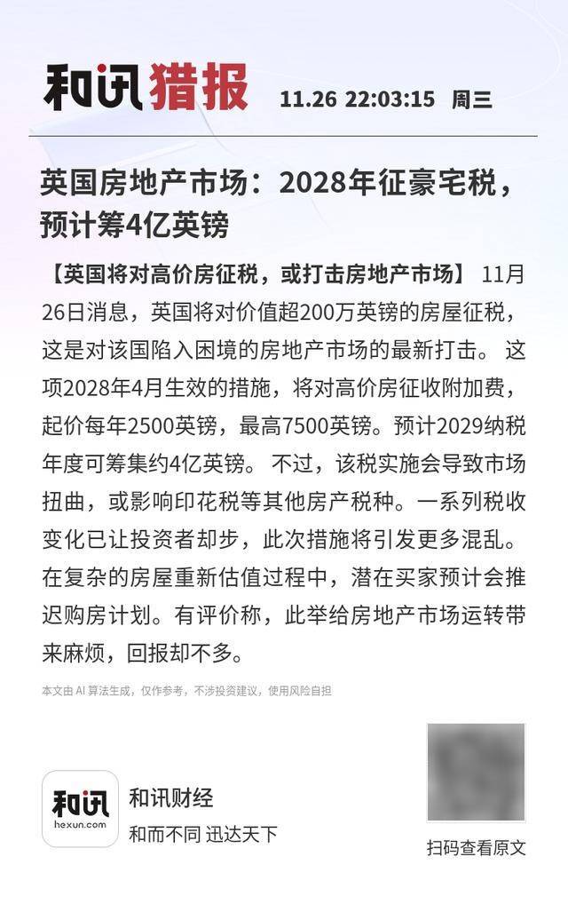 【英国将对高价房征税,或打击房地产市场】11月26日消息,英国将对价值超200万英镑的房屋征税,这是对该国陷入困境的房地产市场的最新打击。这项2028年4月生效的措施,将对高价房征收附加费,起价每年2500英镑,最高7500英镑。预计2029纳税年度可筹集约4亿英镑。不过,该税实施会导致市场扭曲,或影响印花税等其他房产税种。一系列税收变化已让投资者却步,此次措施将引发更多混乱。在复杂的房屋重新估值过程中,潜在买家预计会推迟购房计划。有评价称,此举给房地产市场运转带来麻烦,回报却不多。