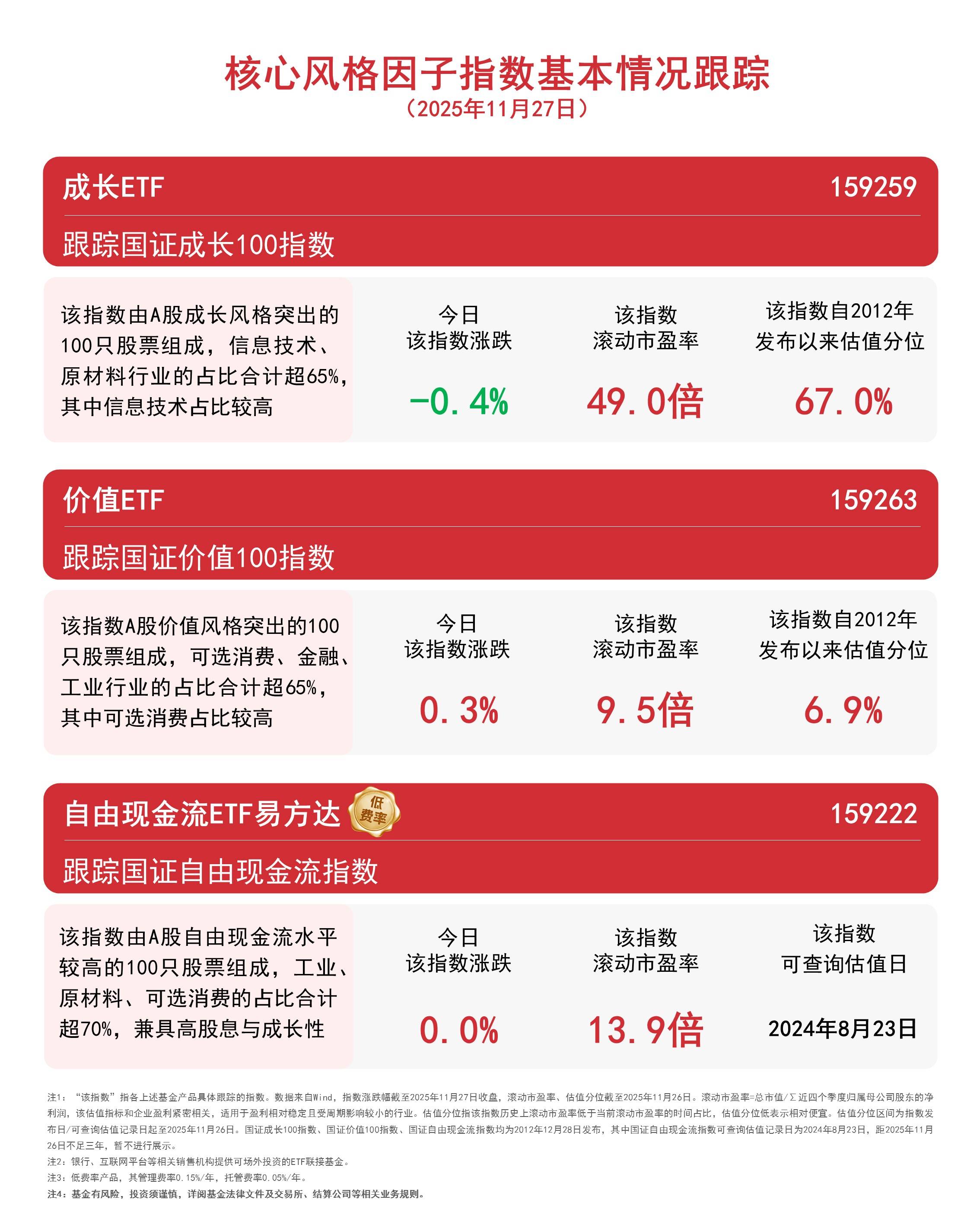 大盘午后集体回落,银行、煤炭等价值板块逆势走强,带动相关指数上涨。截至收盘,国证价值100指数上涨0.3%,国证自由现金流指数上涨0.01%,国证成长100指数下跌0.4%。