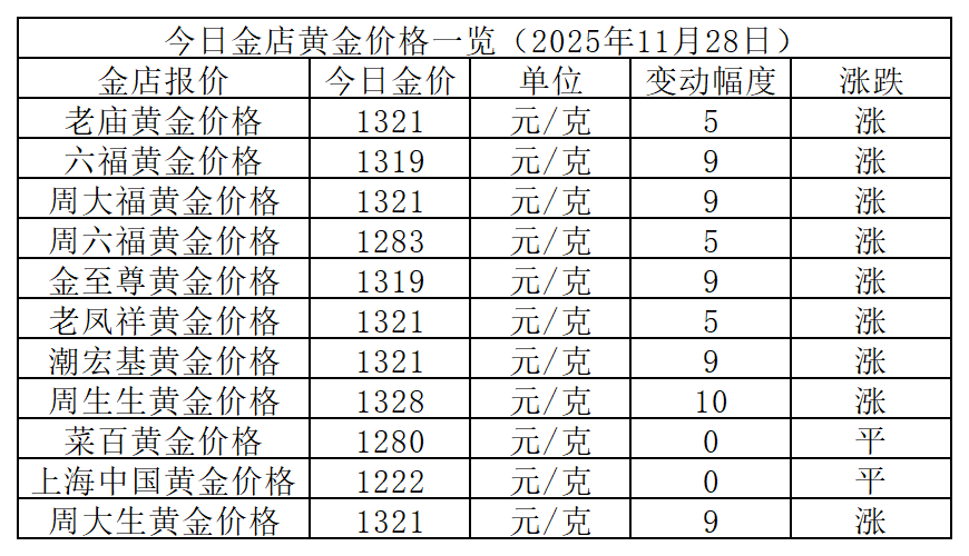 11月28日金价速报,国内品牌金店金价又开始上涨了,整体金价维持在1321元/克左右。其中,周生生黄金大涨10元/克,报价1328元/克,为今日最高价金店;上海中国黄金还是不涨不跌,报价1222元/克,为最低价金店。今日金店金价高低价差继续扩大,报106元/克。