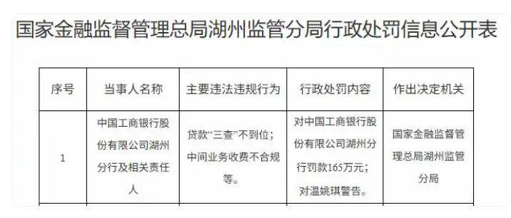 11月27日,国家金融监督管理总局湖州监管分局行政处罚信息公开表显示,工商银行股份有限公司湖州分行(601398.SH/01398.,HK下称“工商银行湖州分行”)因贷款“三查”不到位、中间业务收费不合规等违法违规行为,被处罚款165万元;相关责任人温姚琪被警告。