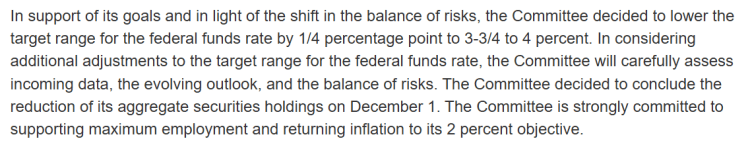 美联储主席鲍威尔10月29日在议息会议结束后曾宣布,下调联邦基金利率25个基点,使基础利率维持在3.75%至4.00%区间,同时自12月1日起将停止“缩表”,即暂停量化紧缩操作。