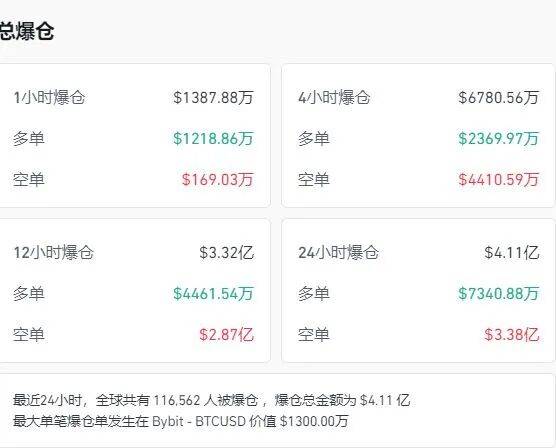 数据显示,24小时,加密货币全网超11万人爆仓,4.11亿美元(约合人民币29亿元)“灰飞烟灭”。