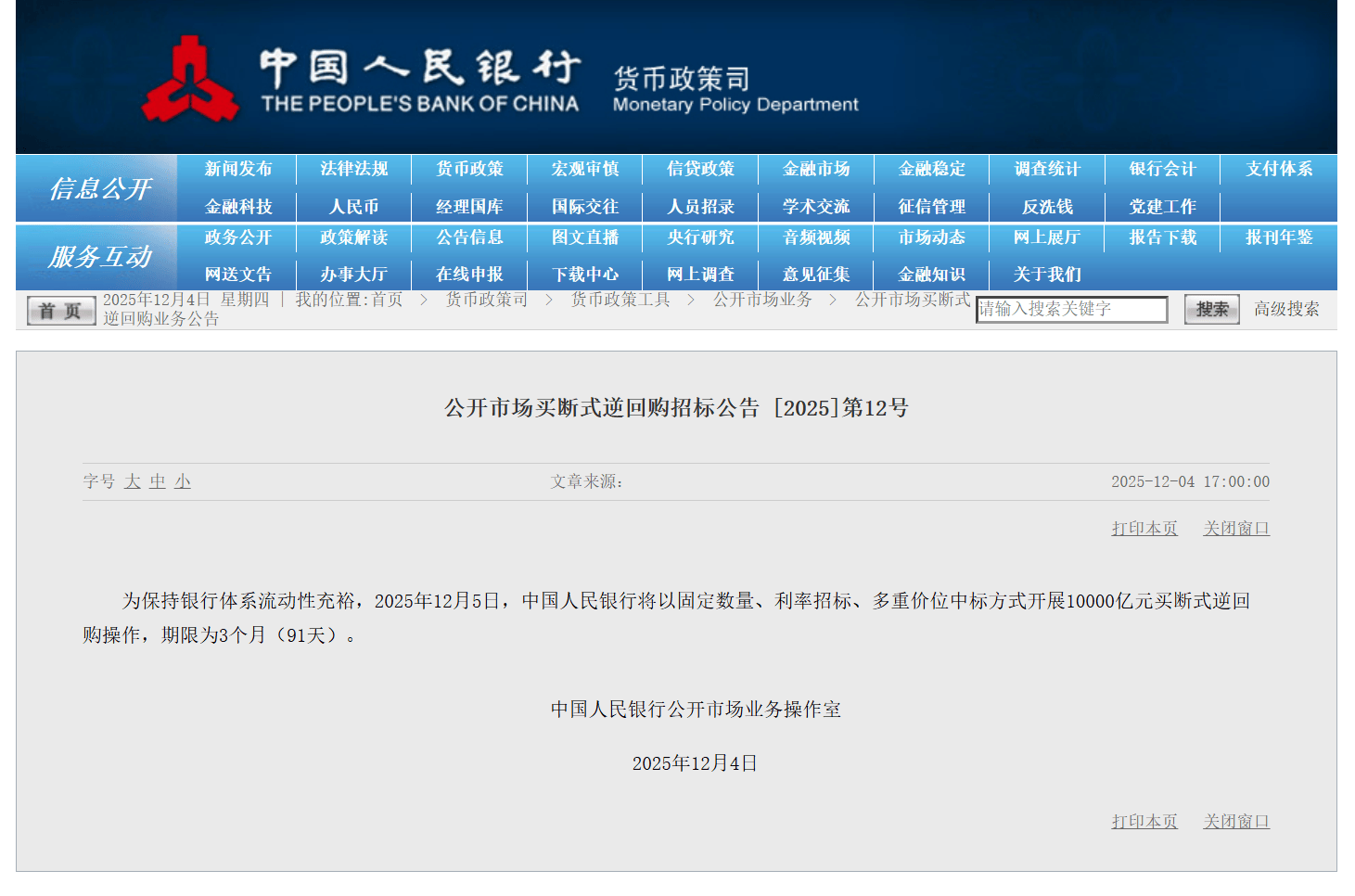 中国人民银行公开市场业务操作室12月4日发布公告:为保持银行体系流动性充裕,2025年12月5日,中国人民银行将以固定数量、利率招标、多重价位中标方式开展10000亿元买断式逆回购操作,期限为3个月(91天)。