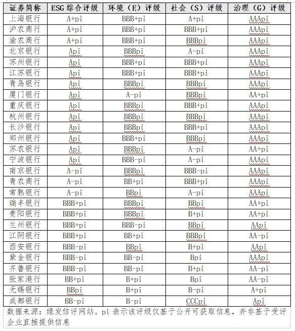 根据绿发信评网站数据,中国财富网关注到,区域性银行评级结果分化特征明显。上海银行、沪农商行、渝农商行获得最高的A+pi评级,张家港行、无锡银行和成都银行级别较低,分别为BB+pi、BBpi和BB-pi。大部分银行级别分布在Api至BBB-pi,其中,北京银行、苏州银行、江苏银行、青岛银行、厦门银行、重庆银行、杭州银行、长沙银行、郑州银行、苏农银行和宁波银行级别为Api;南京银行、青农商行和常熟银行级别为A-pi;瑞丰银行、贵阳银行、兰州银行和江阴银行级别为BBB+pi;西安银行、紫金银行和齐鲁银行级别为BBB-pi。整体来看,区域性银行在治理(G)维度表现较为突出,而在环境(E)与社会(S)维度普遍存在提升空间。