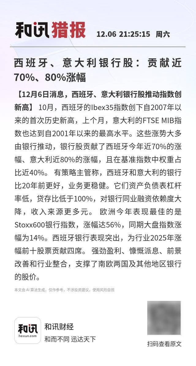 【12月6日消息,西班牙、意大利银行股推动指数创新高】10月,西班牙的Ibex35指数创下自2007年以来的首次历史新高,上个月,意大利的FTSE MIB指数也达到自2001年以来的最高水平。这些涨势大多由银行推动,银行股贡献了西班牙今年近70%的涨幅、意大利近80%的涨幅,且在基准指数中权重占比近40%。 有策略主管称,西班牙和意大利的银行比20年前更好,业务更稳健。它们资产负债表杠杆率低,贷存比低于100%,对银行同业融资依赖度大降,收入来源更多元。 欧洲今年表现最佳的是Stoxx600银行指数,涨幅达56%,同期大盘指数涨幅为14%。西班牙银行表现突出,为行业2025年涨幅前十股票贡献四席。 强劲盈利、慷慨派息、前景改善和行业整合,支撑了南欧两国及其他地区银行的股价。