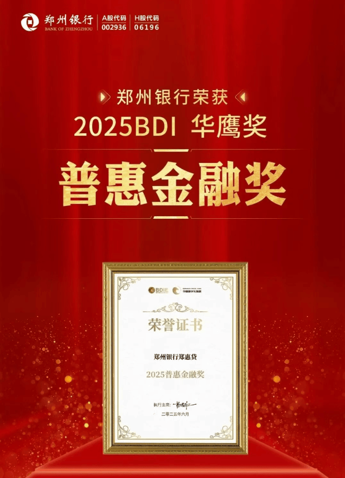 近日,在亚太银行联盟组委会主办的2025华鹰奖BDI数字化指数评选活动中,郑州银行凭借普惠金融创新贷款产品“郑惠贷”,荣获“2025BDI华鹰奖普惠金融奖”。