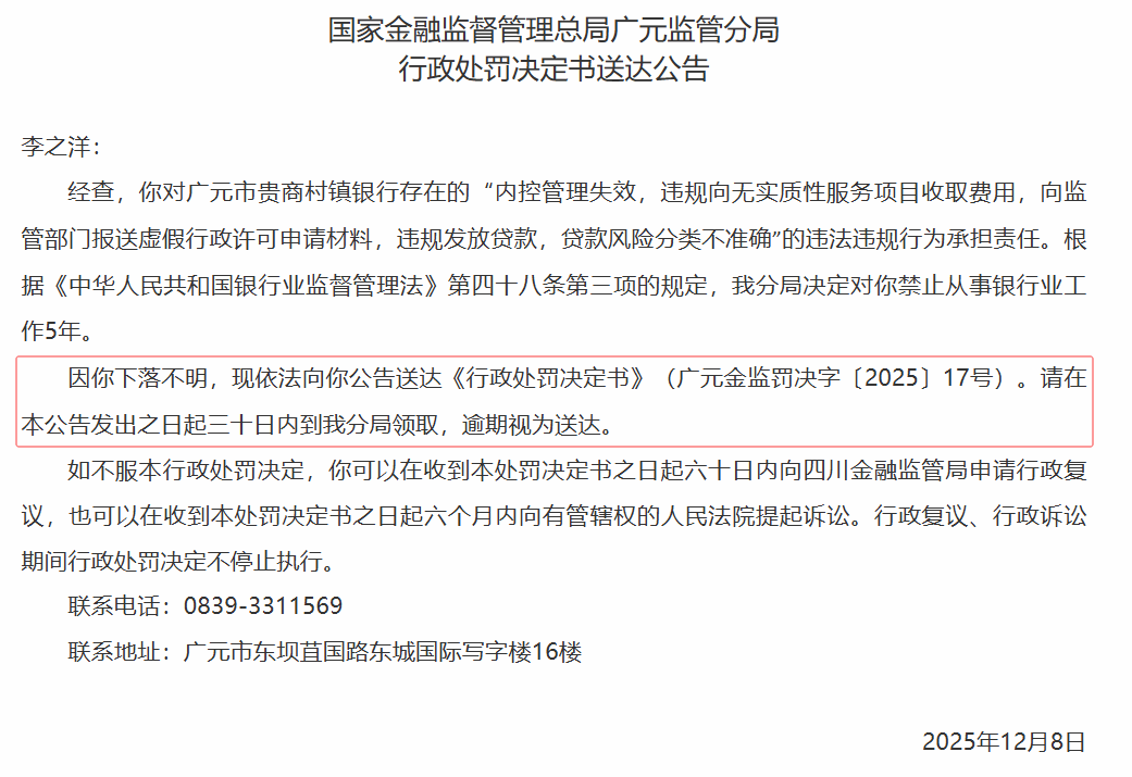 “因你下落不明,现依法向你公告送达《行政处罚决定书》(广元金监罚决字〔2025〕17号)。请在本公告发出之日起三十日内到我分局领取,逾期视为送达。”