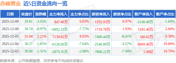 赤峰黄金(600988)12月... 证券之星消息,截至2025年12月9日收盘,赤峰黄金(600988)报收于29.81元,下跌3.03...