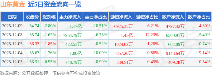 山东黄金(600547)12月... 证券之星消息,截至2025年12月9日收盘,山东黄金(600547)报收于34.74元,下跌2.8%...
