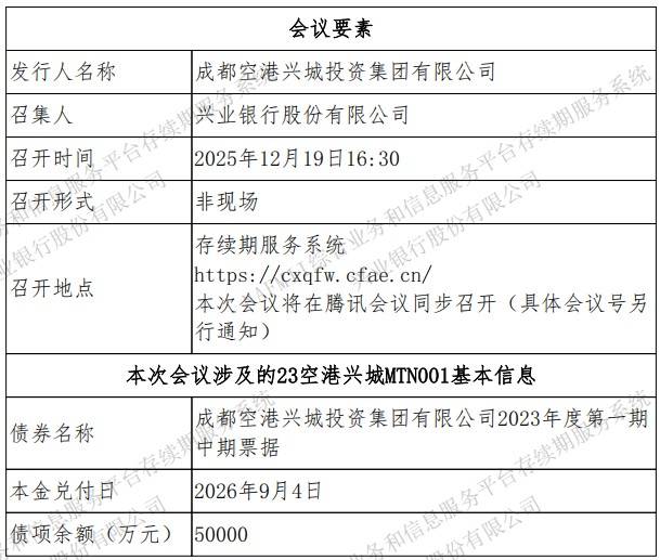 根据2025年7月30日中共中央政治局会议关于“积极稳妥化解地方政府债务风险,严禁新增隐性债务,有力有序有效推进地方融资平台出清”的精神,结合四川省、成都市、双流区加快国有企业转型升级、优化债务结构、强化财务杠杆韧性的要求,成都空港兴城投资集团有限公司经审慎研究,决定召开成都空港兴城投资集团有限公司2023年度第一期中期票据2025年度第一次持有人会议。审议缩短本次持有人会议召集、召开、表决程序的相关时限要求,并将“23空港兴城MTN001”兑付日提前至2026年6月4日相关事项。