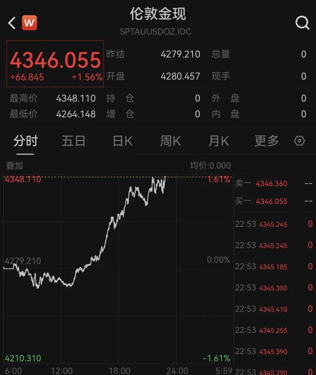 值得注意的是,黄金再度直线大涨,截至发稿,现货黄金涨超1.5%,已涨至4346美元左右,COMEX黄金也涨超1.5%。