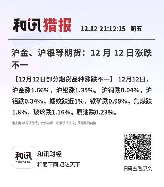 【12月12日部分期货品种涨跌不一】12月12日,沪金涨1.66%,沪银涨1.35%。沪铜跌0.04%,沪铝跌0.34%,螺纹跌近1%,铁矿跌0.99%,焦煤跌1.8%,玻璃跌1.16%,原油跌0.23%。