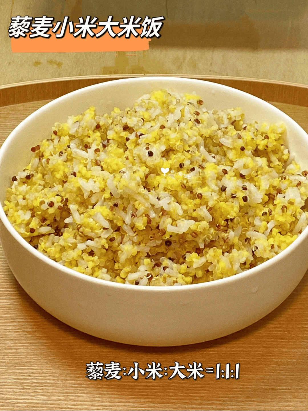 做法:大米和小米、藜麦一起放电饭煲,蒸好后拌点橄榄油和低盐酱油,配清炒蔬菜吃。
