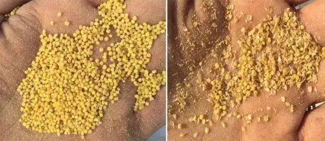 ▲左图为去掉的谷皮的小米(待挑杂质),右图为吹掉的谷皮